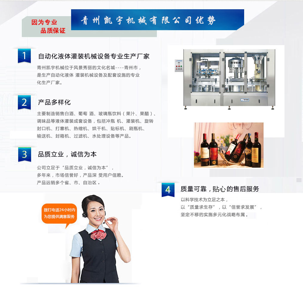 青州凯宇机械位于风景秀丽的文化名城~青州市,是生产自动化液体 灌装机械设备及配套设施的专业生产厂家。主要制造销售葡萄 酒、玻璃瓶饮料(果汁、果醋)、白酒、调昧品等液体灌装成套设备,生产的玻璃瓶饮料洗瓶灌装封口设备销往河南、河北、山东、四川和广东等多个城市。    公司立足于“品质立业,诚信为本”,多年来,市场信誉好,产品深 受用户信赖。以“质量求生存”,以“信誉求发展”,坚定不移的 实施多元化战略布属,紧紧围绕研发、调整任务,不断强化灌 装行业业务的主体地位和主导作用,努力打造良好全自动化控制 的灌装生产流水线,使我公司成为现代化良好灌装设备的供应商。   愿我们精诚合作,携手共进,共图发展。 ......更多详细信息